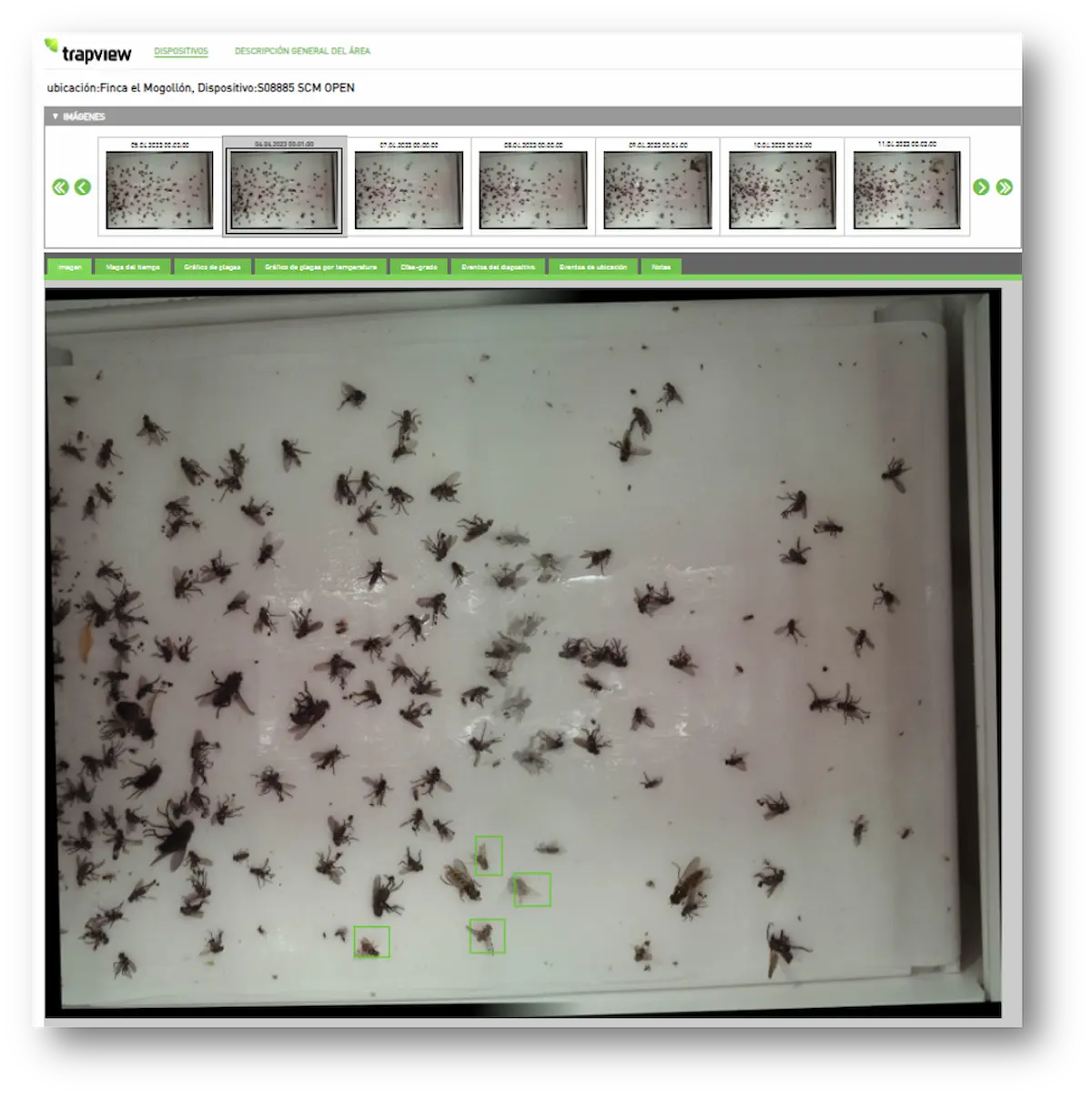 Incorporada la feromona específica para la plaga, las cámaras instaladas en la trampa van realizando capturas diarias y son almacenadas en la plataforma.